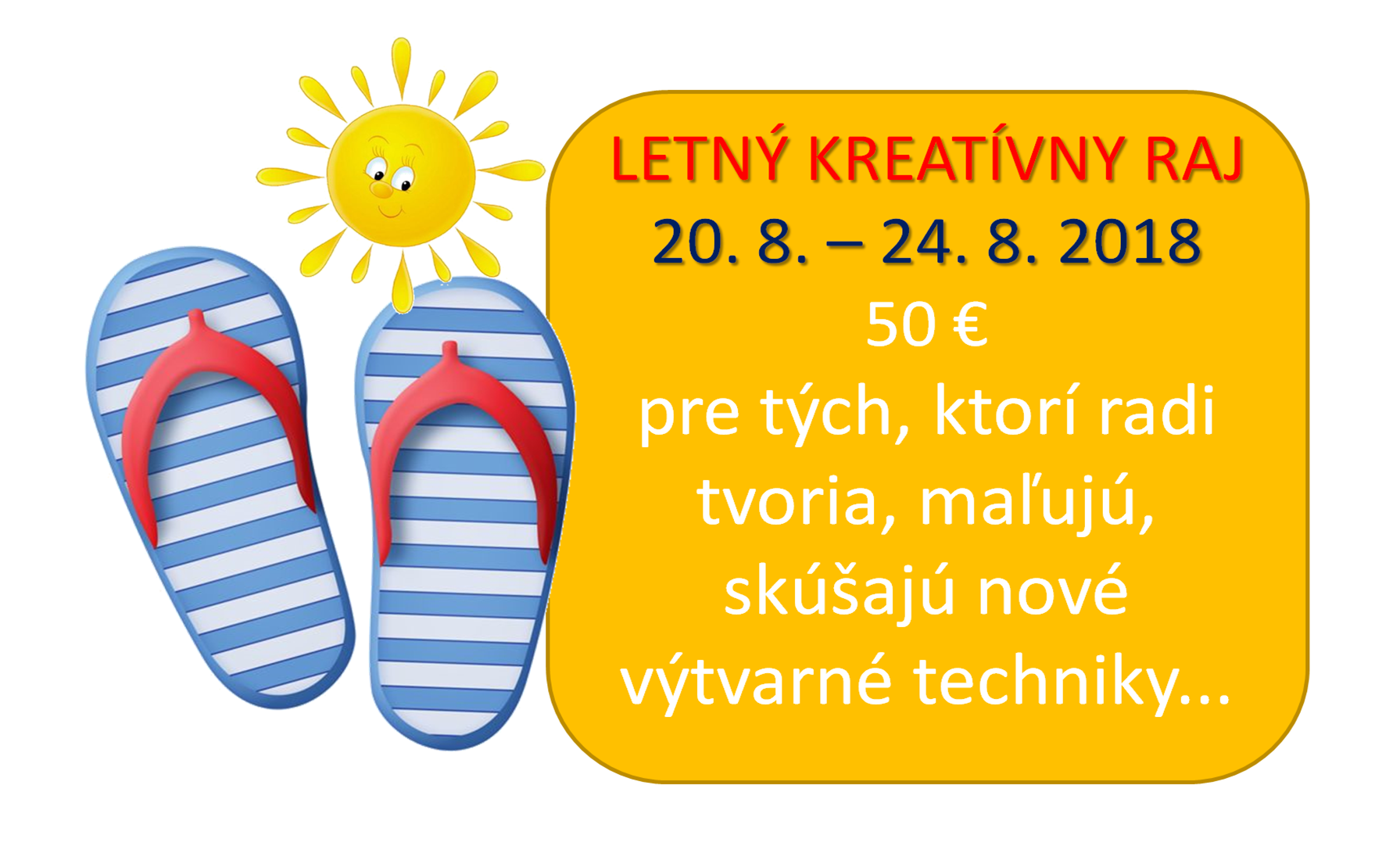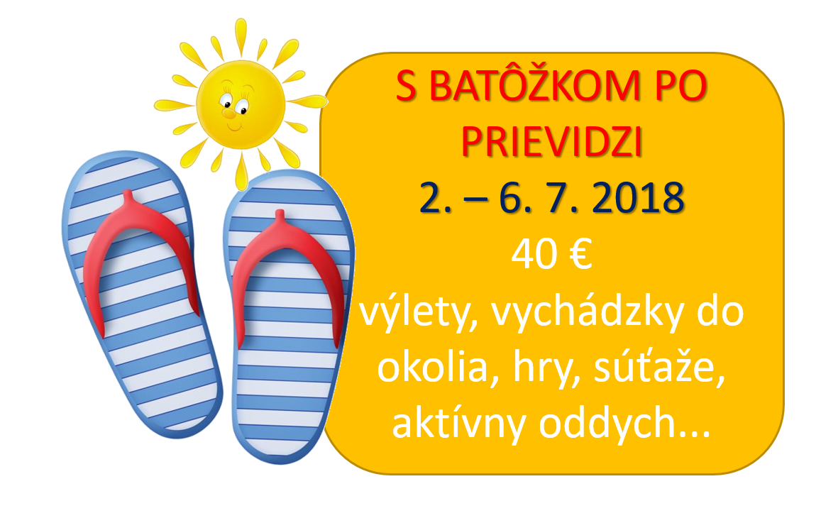 Prihlásiť sa môžete vyplnením prihlášky a zaplatením poplatku podľa denného tábora, ktorý si vyberiete, v pracovných dňoch v kancelárii centra do 12.00 hod, popoludní do 20.00 hod na informáciách na prízemí centra do konca mája 2018. O zaplatení vám bude vydaný doklad. V cene sú zahrnuté všetky poplatky (poistenie, strava, vstupenky, cestovné, materiál a pod.) Ponuka platí pre deti mesta Prievidza aj iných obcí. Počet miest je obmedzený. Dieťa je zaradené do zoznamu až po uhradení poplatku. Viac informácií tu... Prihláška tu... Viac informácií na tel. čísle 046/543 24 70 alebo |