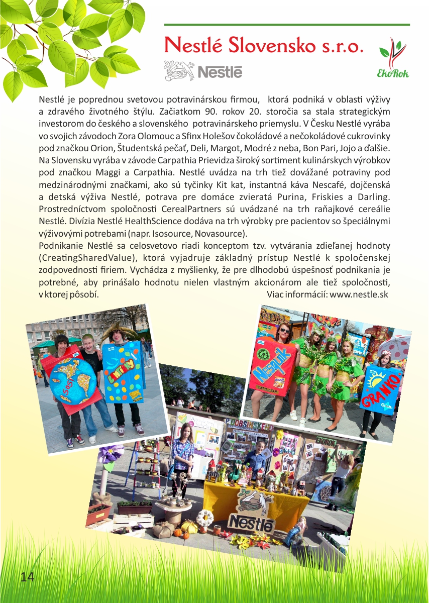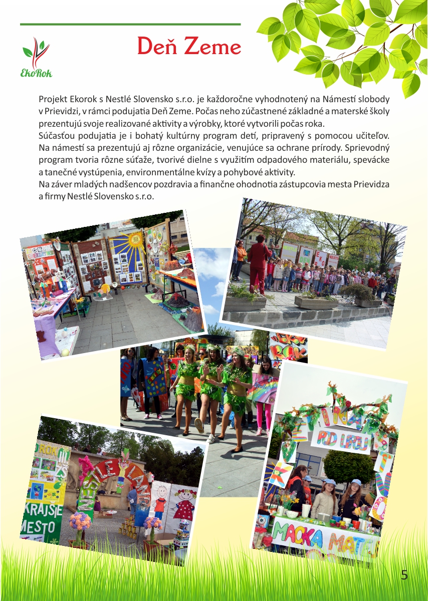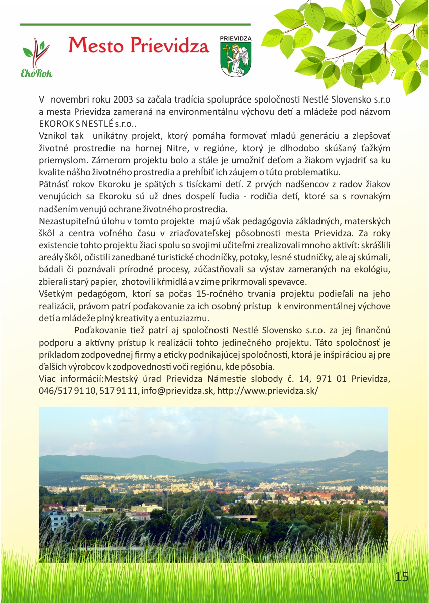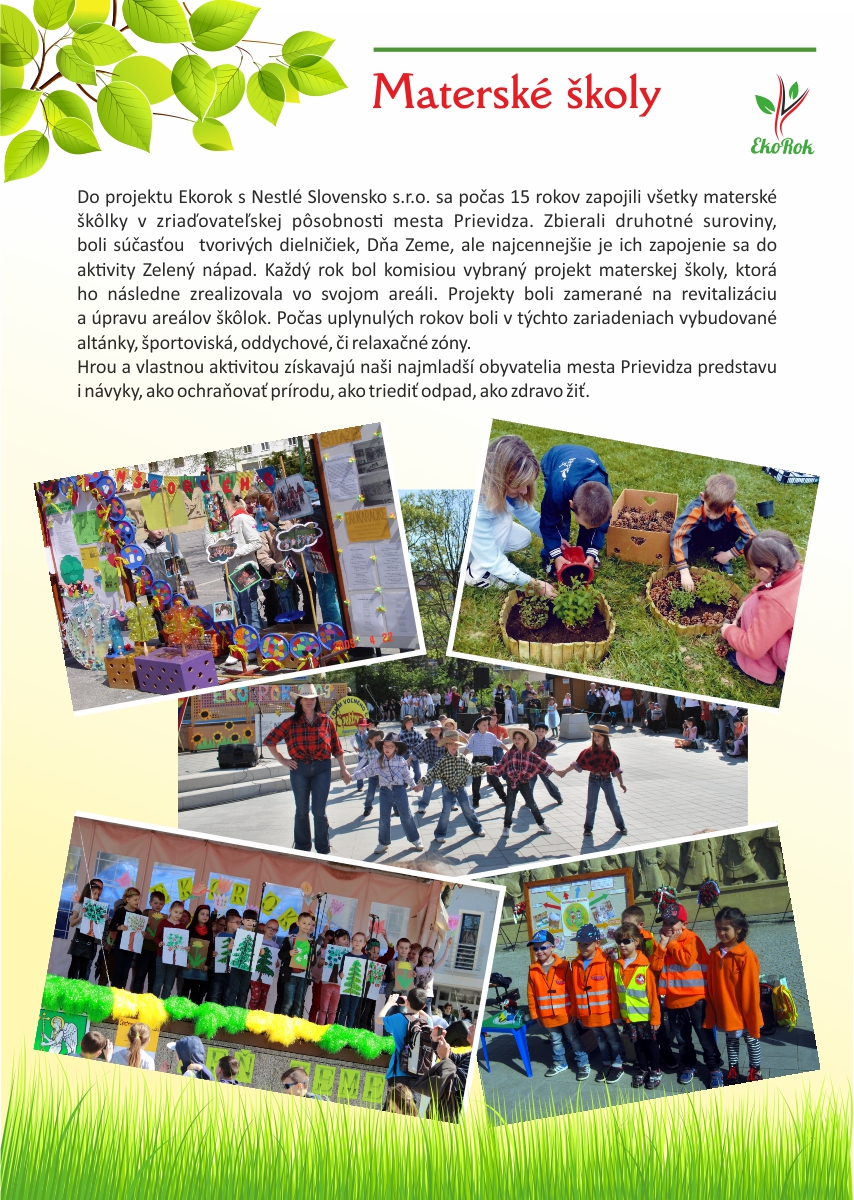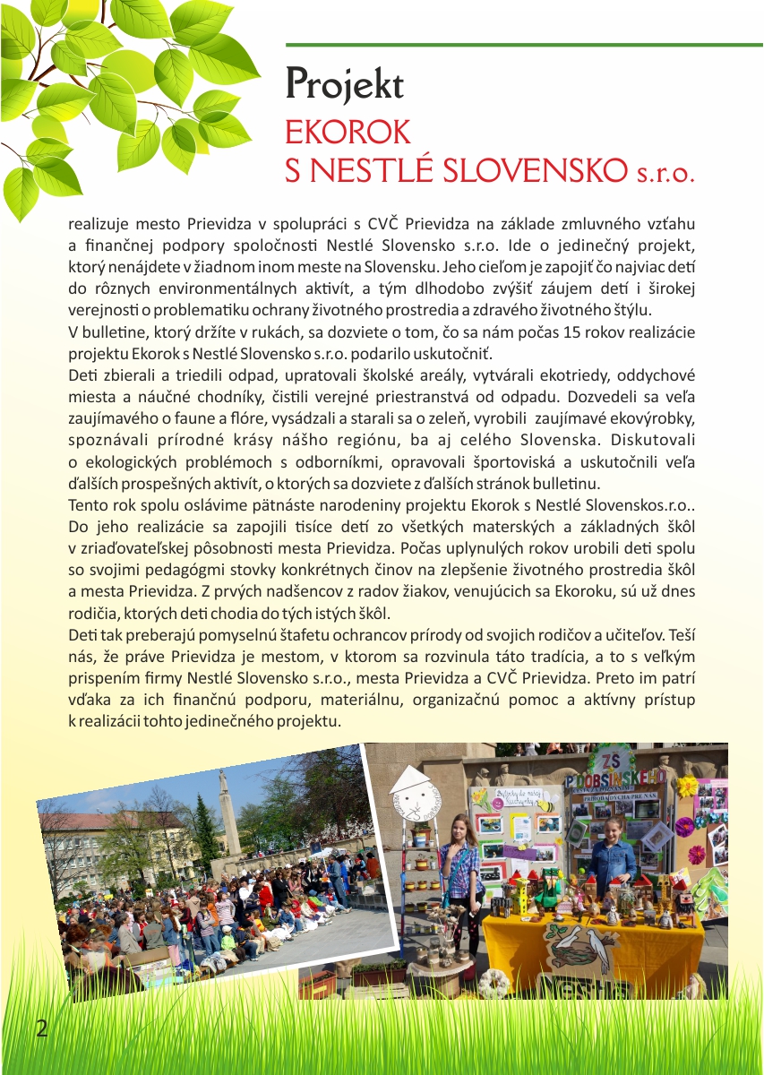 Projekt Ekorok s Nestlé Slovensko s.r.o. realizuje mesto Prievidza v spolupráci s CVČ Prievidza na základe zmluvného vzťahu a finančnej podpory spoločnosti Nestlé Slovensko s.r.o. Ide o jedinečný projekt, ktorý nenájdete v žiadnom inom meste na Slovensku. Jeho cieľom je zapojiť čo najviac detí do rôznych environmentálnych aktivít, a tým dlhodobo zvýšiť záujem detí i širokej verejnosti o problematiku ochrany životného prostredia a zdravého životného štýlu.Tento rok sme spolu oslávili pätnáste narodeniny projektu Ekorok s Nestlé Slovenskos.r.o.. Do jeho realizácie sa zapojili tisíce detí zo všetkých materských a základných škôl v zriaďovateľskej pôsobnosti mesta Prievidza. Počas uplynulých rokov urobili deti spolu so svojimi pedagógmi stovky konkrétnych činov na zlepšenie životného prostredia škôl a mesta Prievidza. Z prvých nadšencov z radov žiakov, venujúcich sa Ekoroku, sú už dnes rodičia, ktorých deti chodia do tých istých škôl. Deti tak preberajú pomyselnú štafetu ochrancov prírody od svojich rodičov a učiteľov. Teší nás, že práve Prievidza je mestom, v ktorom sa rozvinula táto tradícia, a to s veľkým prispením firmy Nestlé Slovensko s.r.o., mesta Prievidza a Centra voľného času v Prievidzi.