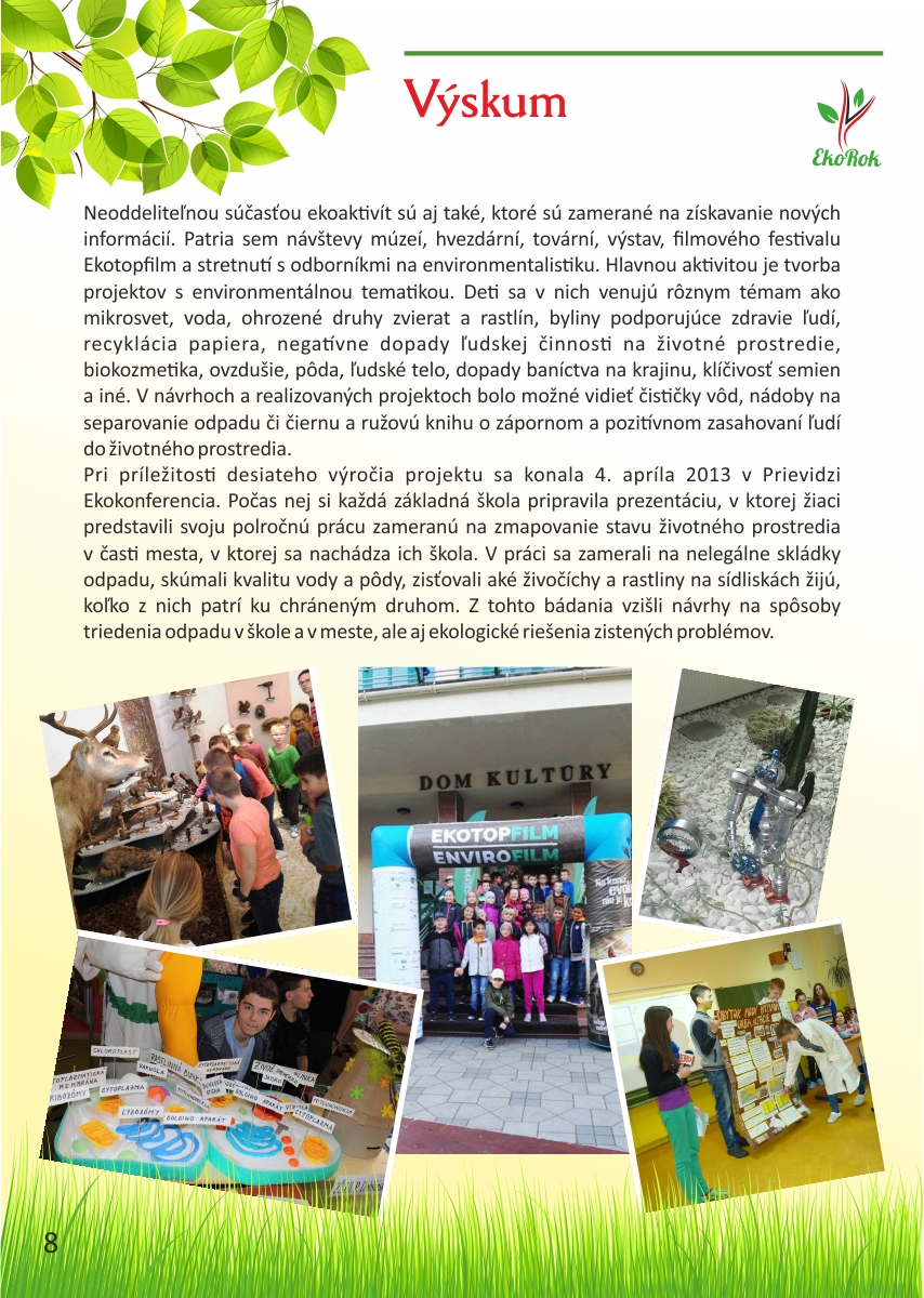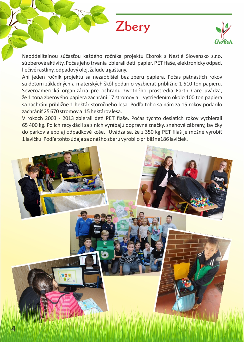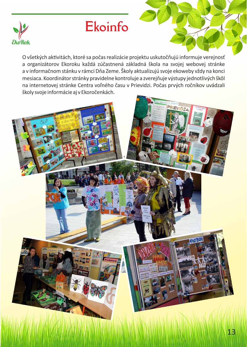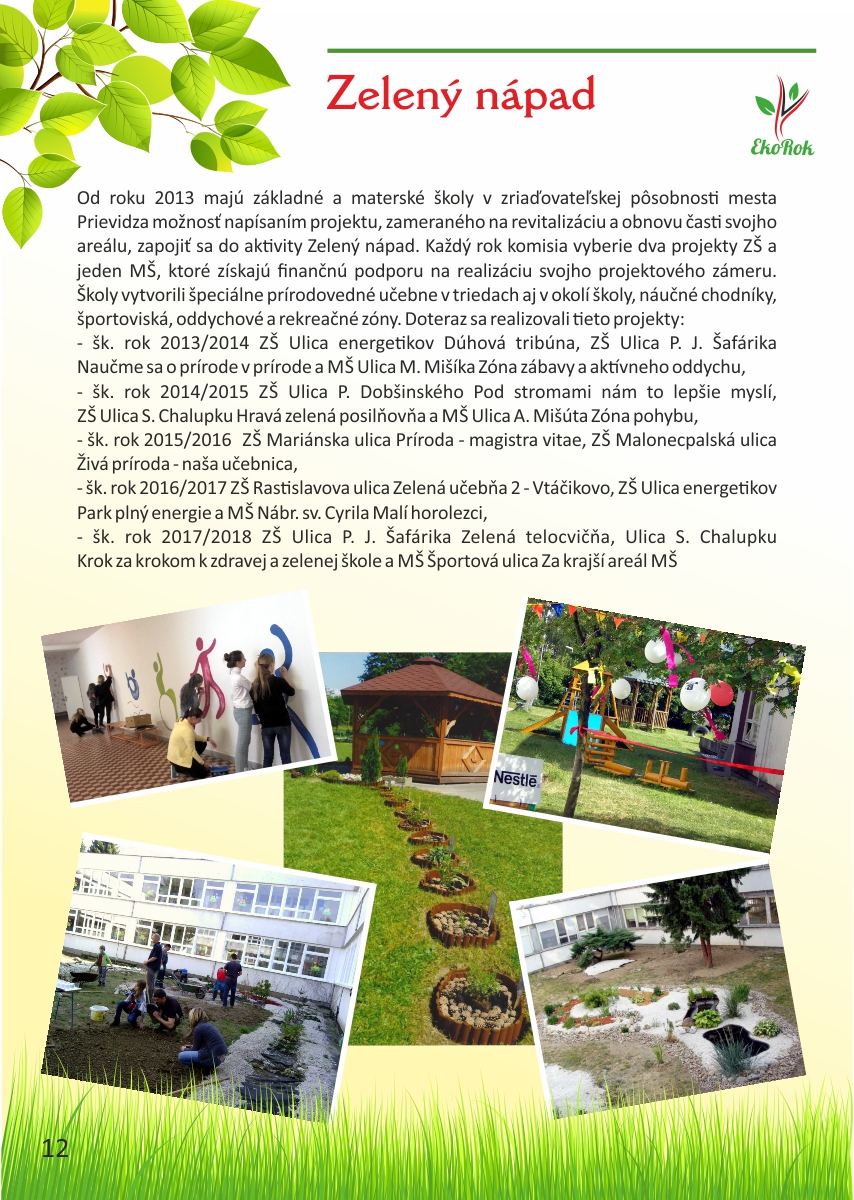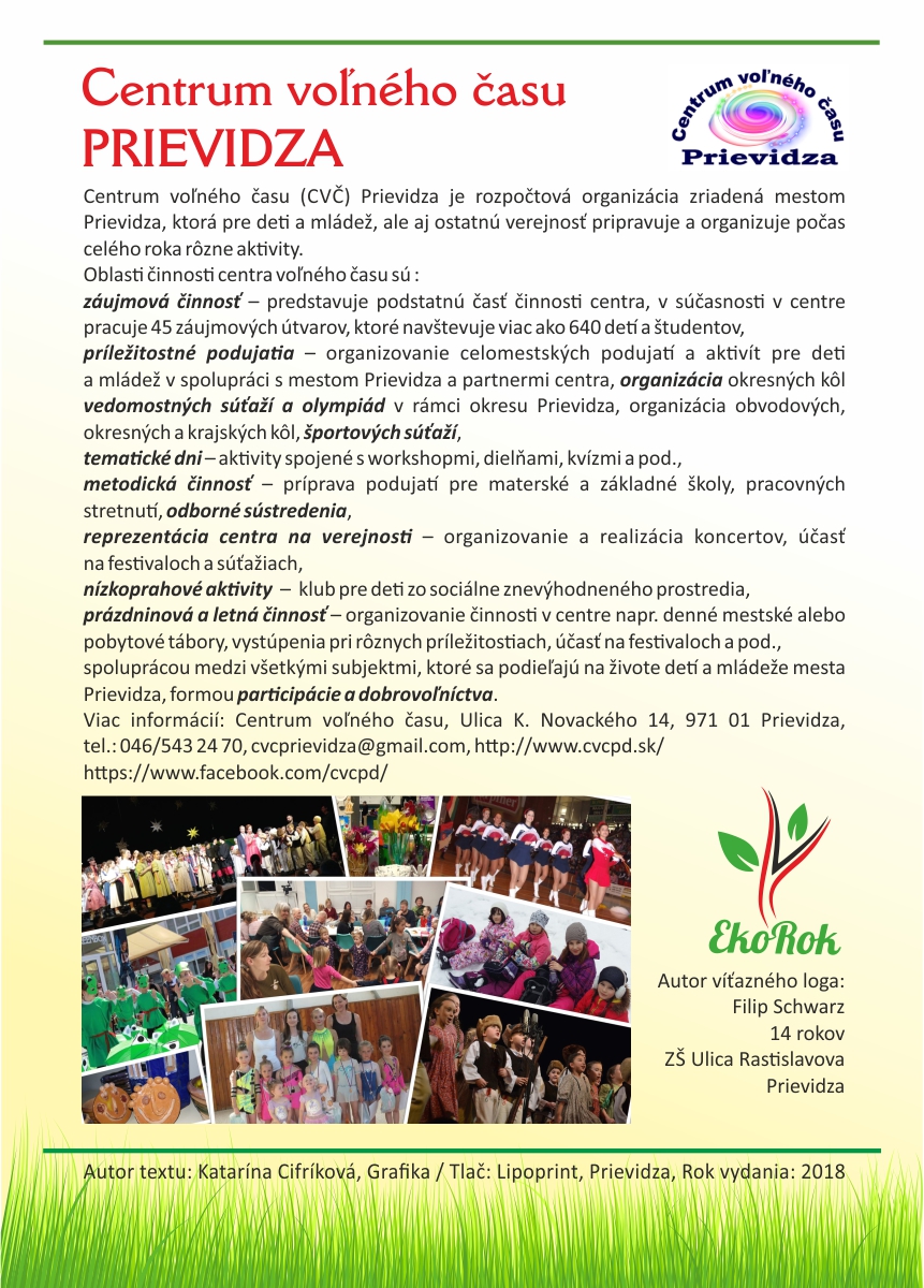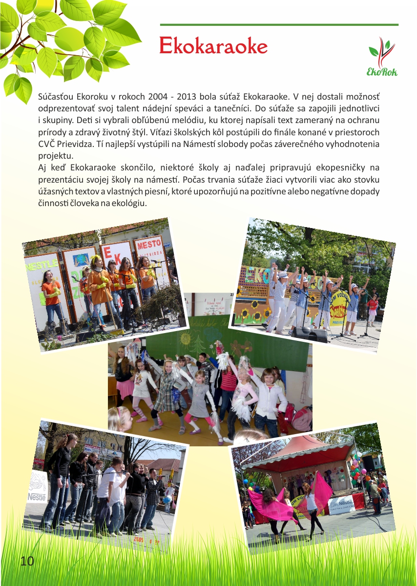 Projekt Ekorok s Nestlé Slovensko s.r.o. realizuje mesto Prievidza v spolupráci s CVČ Prievidza na základe zmluvného vzťahu a finančnej podpory spoločnosti Nestlé Slovensko s.r.o. Ide o jedinečný projekt, ktorý nenájdete v žiadnom inom meste na Slovensku. Jeho cieľom je zapojiť čo najviac detí do rôznych environmentálnych aktivít, a tým dlhodobo zvýšiť záujem detí i širokej verejnosti o problematiku ochrany životného prostredia a zdravého životného štýlu.Tento rok sme spolu oslávili pätnáste narodeniny projektu Ekorok s Nestlé Slovenskos.r.o.. Do jeho realizácie sa zapojili tisíce detí zo všetkých materských a základných škôl v zriaďovateľskej pôsobnosti mesta Prievidza. Počas uplynulých rokov urobili deti spolu so svojimi pedagógmi stovky konkrétnych činov na zlepšenie životného prostredia škôl a mesta Prievidza. Z prvých nadšencov z radov žiakov, venujúcich sa Ekoroku, sú už dnes rodičia, ktorých deti chodia do tých istých škôl. Deti tak preberajú pomyselnú štafetu ochrancov prírody od svojich rodičov a učiteľov. Teší nás, že práve Prievidza je mestom, v ktorom sa rozvinula táto tradícia, a to s veľkým prispením firmy Nestlé Slovensko s.r.o., mesta Prievidza a Centra voľného času v Prievidzi.