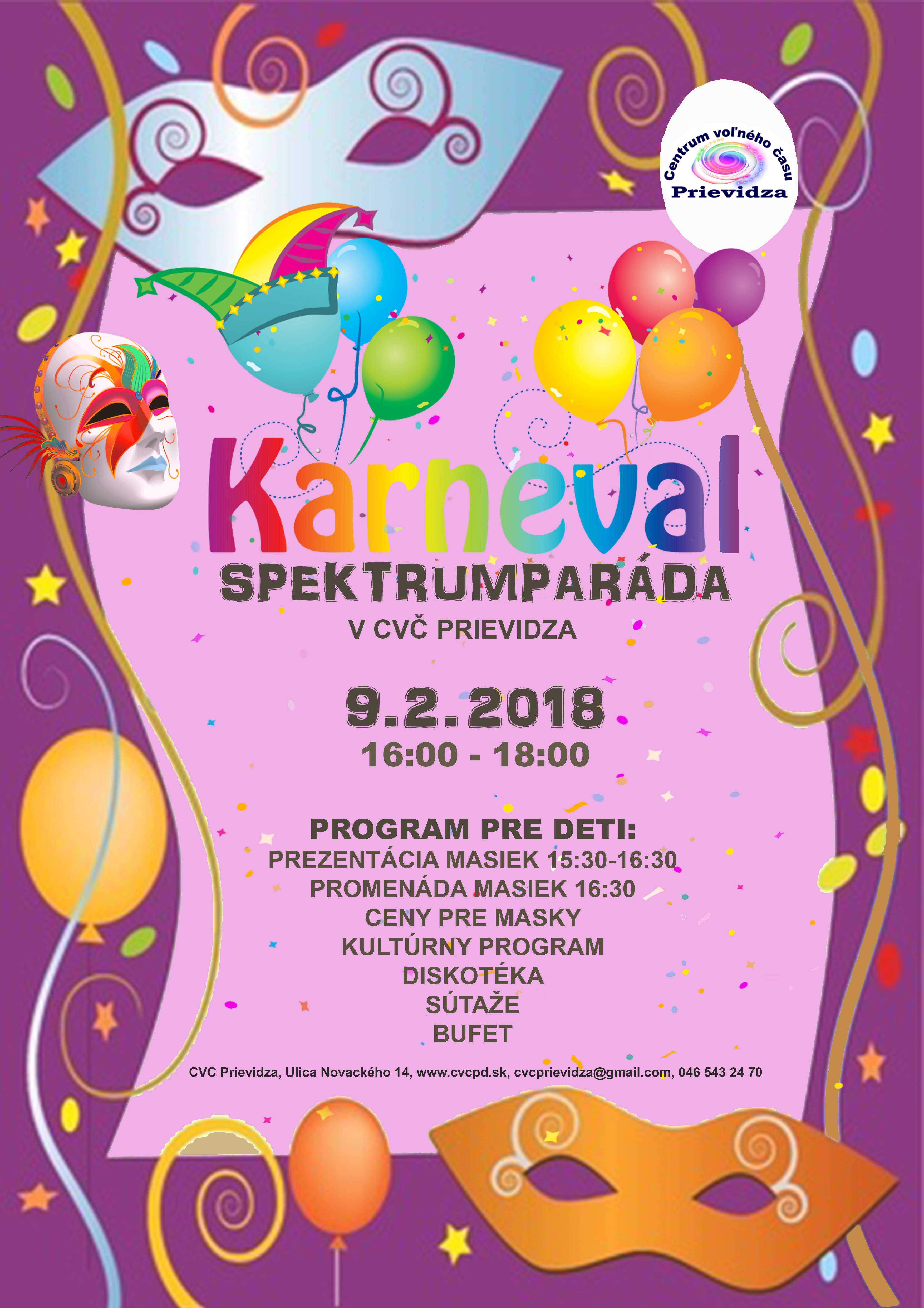 V piatok 9.2.2018 popoludní sa Centrum voľného času Prievidza zaplnilo sedemdesiatimi malými aj väčšími maskami. Zabaviť sa na detský karneval „Spektrumparáda“ sa do centra prišli princezničky, požiarnici, myšacia rodinka, čarodejnice, kovboji a iné postavičky z rozprávkového sveta.