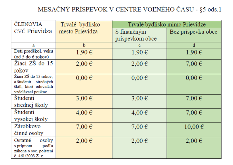 oznamujeme vám, že VZN č.3/2017 s platnosťou od 01. 01. 2018, sa menia príspevky na záujmovú činnosť podľa priloženej tabuľky nižšie. Ide hlavne o poplatok študentov stredných škôl, ktorí ak odovzdali vzdelávací poukaz, nemusia mesačný poplatok za záujmový útvar uhradiť.